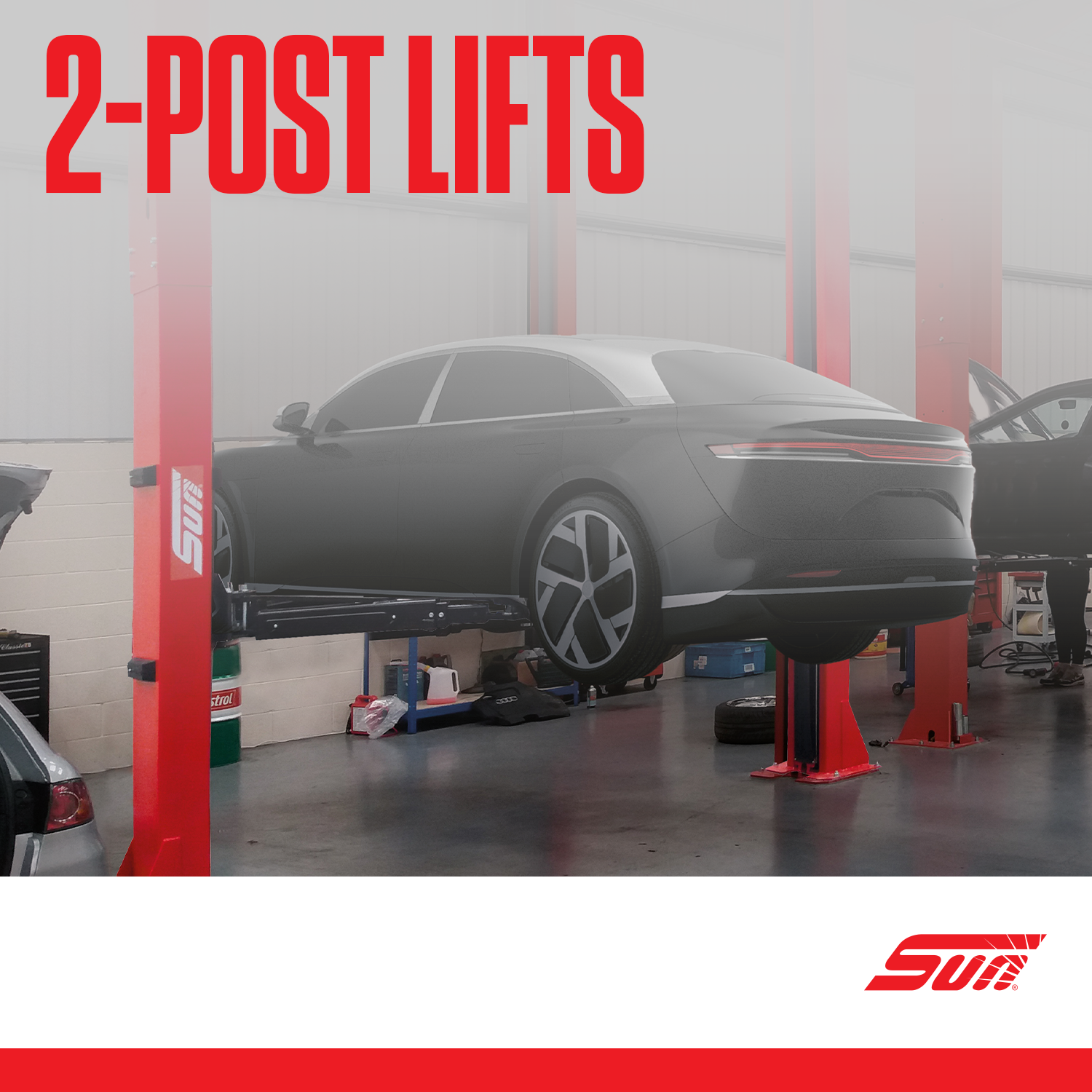 The SUN® two-post car lift with base frame is the perfect solution for you. Available in two configurations 4-tonnes (SVL43) and 5-tonne SVL50 configurations, ideal for lifting a variety of cars and light commercial vehicles.